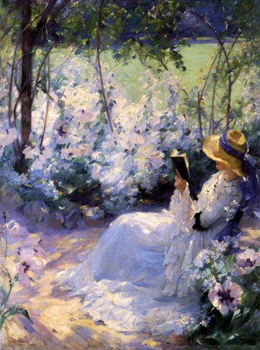 I really like this one, even though I don't speak (or read) the language. I think it's the colors that draw me and the fact that she seems to find reading so interesting that she has put down her watering can in order to read a book.